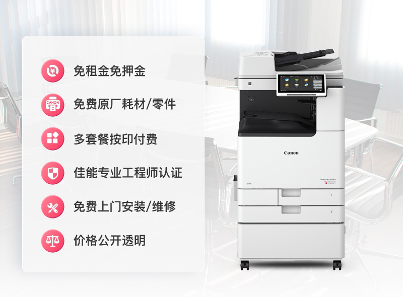 我们作为佳能无忧租赁服务,提供的是全新佳能原厂彩色数码复合机,打印高效、品质过硬、智能交互,且更加节能环保,购买后会有专业工程师提供全面服务。