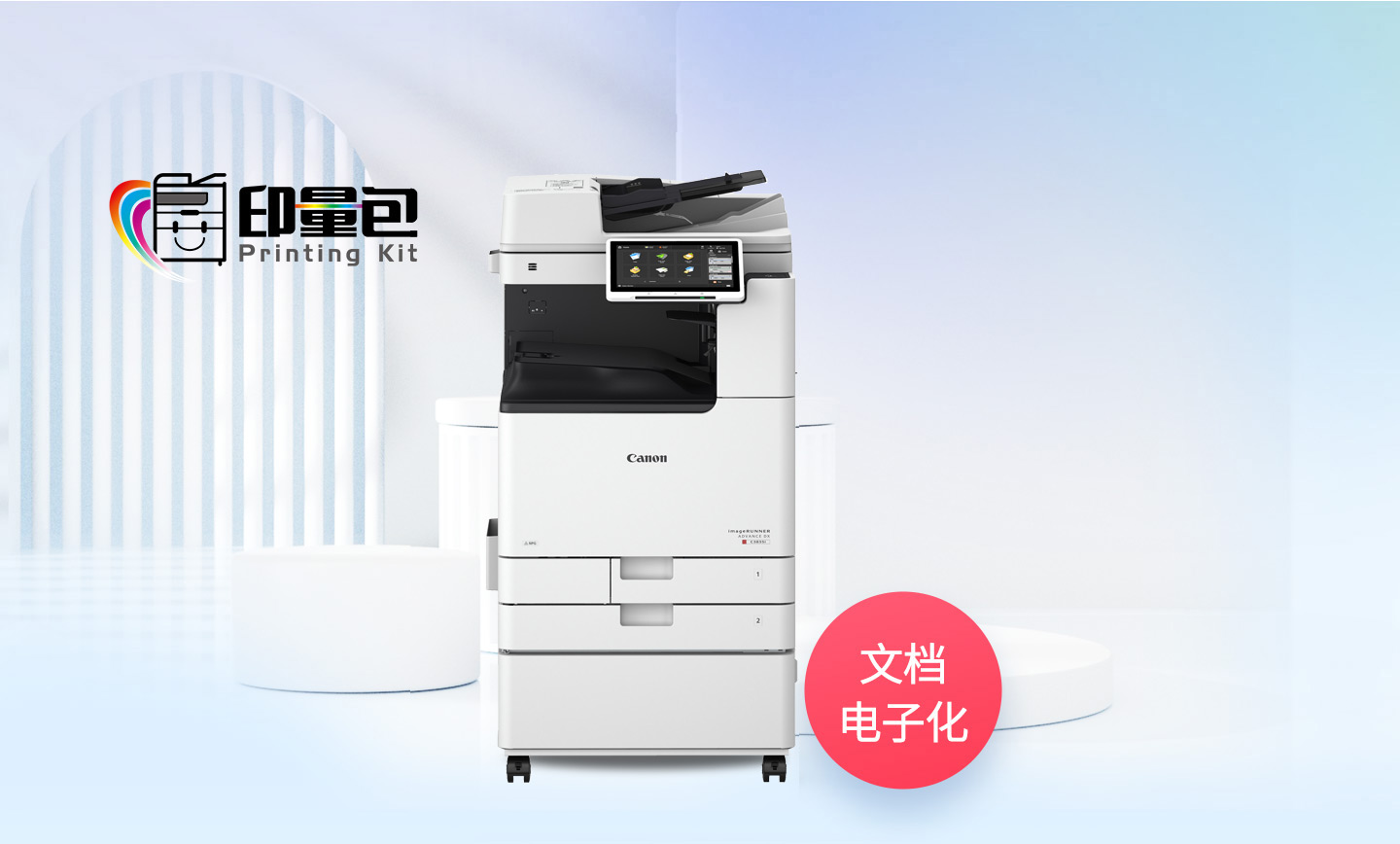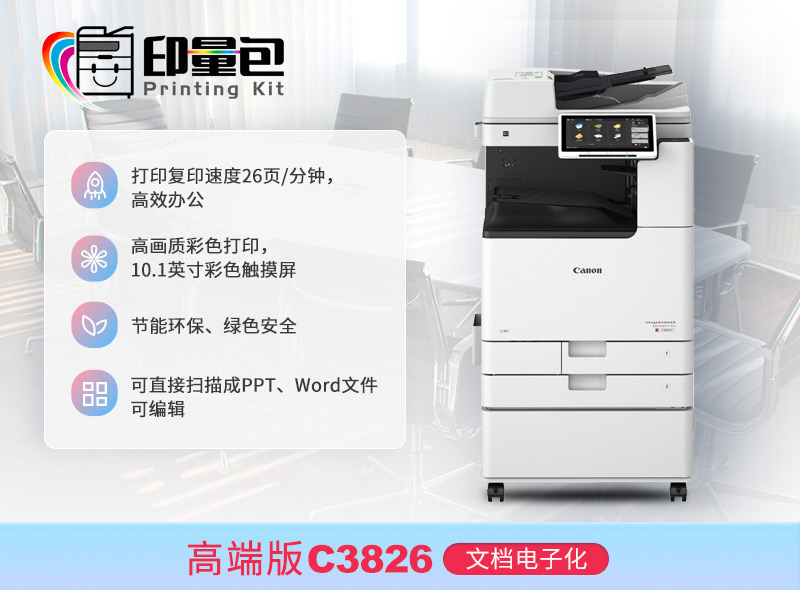首次购买印量包时,租赁1台全新佳能A3彩色复合机主机(含2个纸盒)+双面自动输稿器+工作台供用户使用。佳能认证工程师上门安装调试。